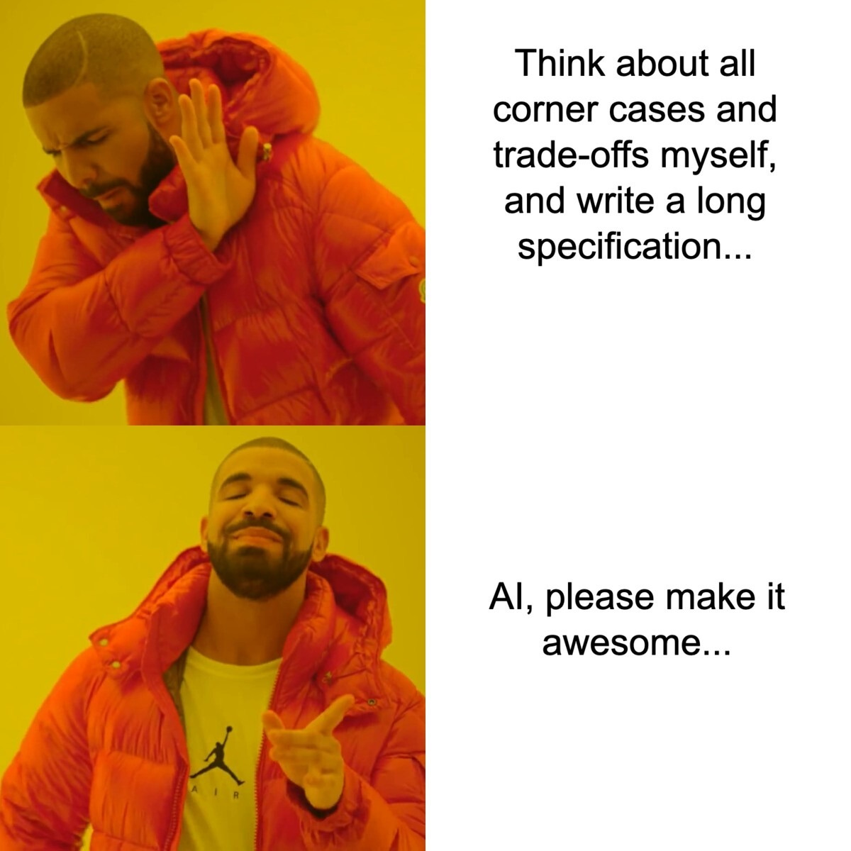 AI can guess answers to those questions. But often there are no generic correct answers to those types of questions. They require you to make choices and these choices will have trade-offs. And writing down these choices, will inevitably become a long, complicated and boring specification.